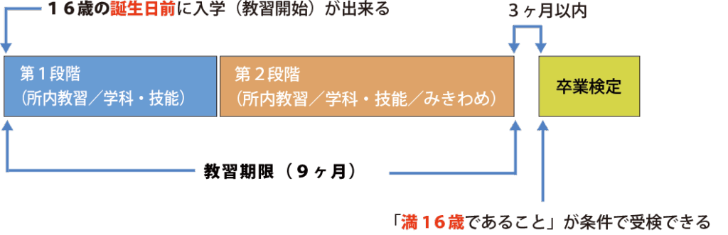 | 入学年齢 | 16歳の誕生日の前から入校はできますが、卒業検定は誕生日を過ぎなければ受けられません |
